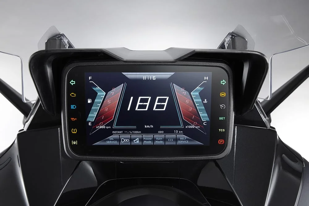 Arhitectura sa unică, bazată pe un șasiu din aluminiu și un design sportiv, este evidențiată de puntea față expansivă, cu aspect de paralelogram deformabil, concepută pentru a valorifica fiecare mișcare a suspensiei KALS (KYMCO Advanced Leaning Suspension). Aceasta este alcătuită din patru amortizoare, fiecare cu o cursă de 98 mm, oferind stabilitate și precizie excepționale. De la jantele din aluminiu până la brațele supradimensionate din aliaj, fiecare componentă a fost proiectată pentru a reduce greutatea și a maximiza controlul.